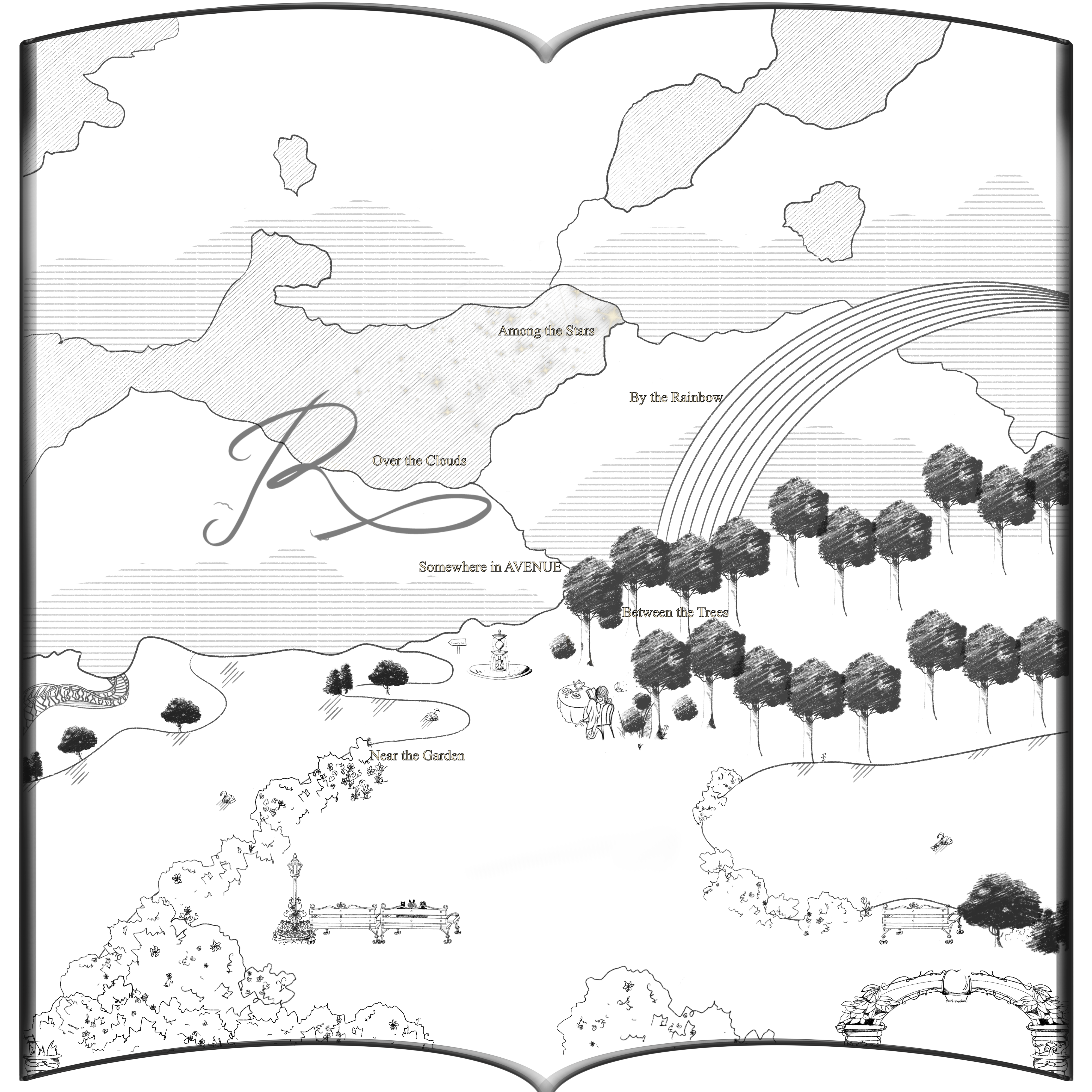 정원 한켠에 정원사의 집, 구름 위로는 고양이 로지와 토끼 버닛의 집,